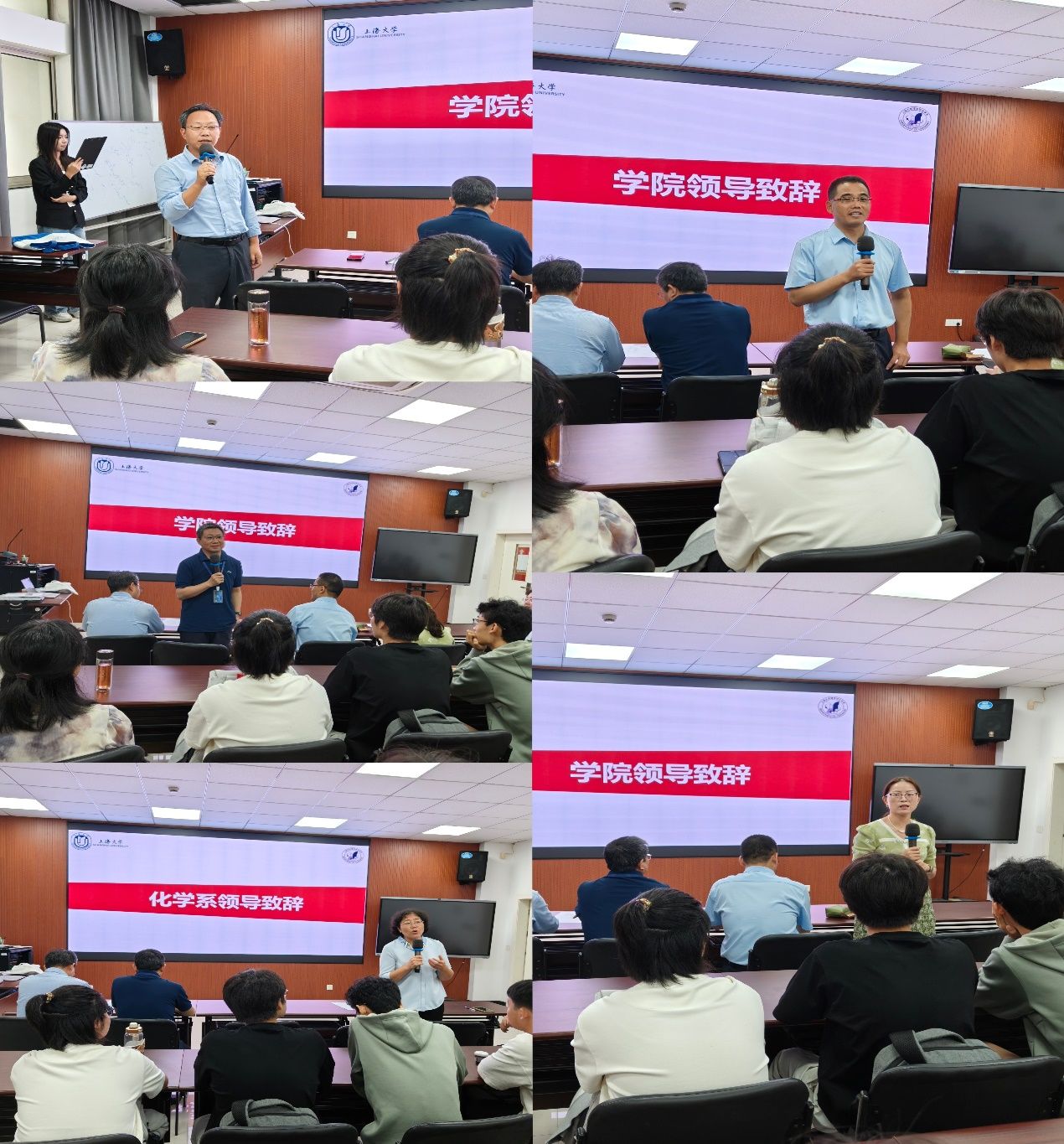 理学院党委副书记、纪委书记刘见礼,理学院党委副书记、副院长姚颖冲,理学院副院长许斌,理学院副院长袁帅,化学系系党总支书记邢菲菲,化学系主任李健,化学系副主任洪玲和赵宏滨老师,化学系党总支副书记林晨亚以及化学系全体导师和本科生辅导员共同出席,为新生送上关怀与指导。 在迎新致辞环节,刘见礼老师欢迎同学们的到来,鼓励大家在充分了解各专业的基础上,选择真正热爱的方向,并积极投身未来的科研实践。姚颖冲老师强调化学系拥有雄厚的师资力量,近年来在人才培养方面取得了突出成果,勉励同学们善用化学系资源,勇于突破自我。许斌老师重点分享了化学学科在教学和科创方面的人才培养配套资源,鼓励同学们积极了解各个专业方向,主动与导师交流,为未来发展打下坚实基础。袁帅老师指出全程导师制在科研启蒙与实验实践中的重要作用,鼓励新生尽早参与课题研究,充分运用化学系平台资源,融入化学系大家庭,实现共同成长。 邢菲菲老师则鼓励同学们积极利用化学系优质的师资队伍,多跟导师交流尽快适应大学生活,明确学习目标,规划发展方向。